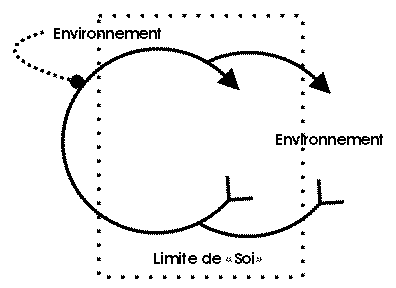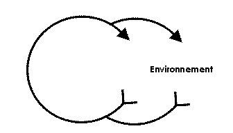 C'est un modèle de ce genre que propose la figure 1; elle représente le modèle minimal dont on puisse parler significativement. Les flèches représentent des chaînes causales et tout le diagramme représente une entité qui consiste en un circuit causal interne autocorrecteur sur lequel agit un environnement et qui agit sur lui. 214 Le lecteur qui désire un tableau plus complet peut imaginer, s'il lui plaît, soit un protozoaire engagé dans un tropisme positif, soit un servomécanisme engagé dans la poursuite d'une cible. En tout cas, quelle que soit l'image que l'on s'en fait, il est de toute façon incapable des codages et évaluations complexes qui sont du domaine de la présente étude. Tout au plus peut-il distinguer des éléments de l'environnement («lumière», «pas de lumière», etc.), mais certainement il ne sera pas capable de conceptualiser des notions telles que «Je perçois de la lumière», «Je vois de la lumière», «La perception de la lumière est un plaisir», ou bien «La lumière m'oblige à aller vers elle». Dans les actions et les autocorrections de systèmes de ce genre à tropismes simples, on ne peut pas percevoir de principes évaluatifs de ces niveaux assez élevés et ce sont des principes de ce genre que nous cherchons à classer. Ce modèle, donc, est utile en ce sens qu'il nous laisse carte blanche[NT 1] pour un cheminement systématique vers l'anthropomorphisme.